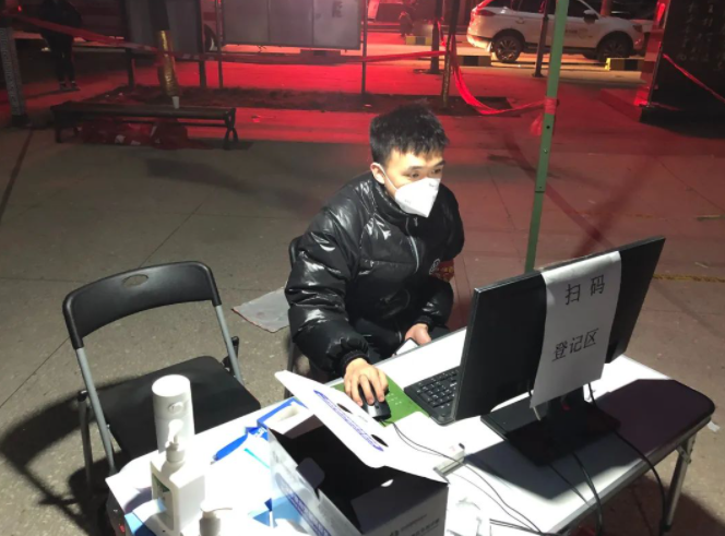 灃京路社區(qū)檢測(cè)點(diǎn),黨員王凱帶領(lǐng)置業(yè)公司工程部、工程二部10名同志布置核酸檢測(cè)場(chǎng)地。