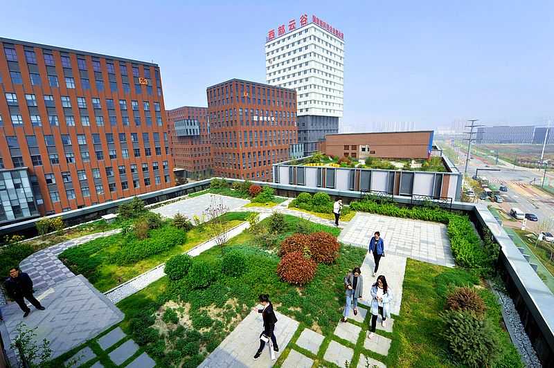 “上樓去散散步吧。”在快節(jié)奏的現(xiàn)代社會(huì),很多被困于城市寫字樓內(nèi)的白領(lǐng),每天工作間歇最大的奢望,便是下樓找一塊綠地放松放松。然而,在灃西新城西部云谷,白領(lǐng)們只需移步樓頂,便能瞬間完成辦公室到公園的無(wú)縫切換。作為建設(shè)海綿城市的重要探索,近年來(lái),灃西新城部分園區(qū)辦公樓上建設(shè)了綠色屋頂。屋頂花園不僅能起到吸收、凈化雨水的作用,同時(shí)還能有效減碳吸碳,降霾去熱,成為城市一道稀有景觀。