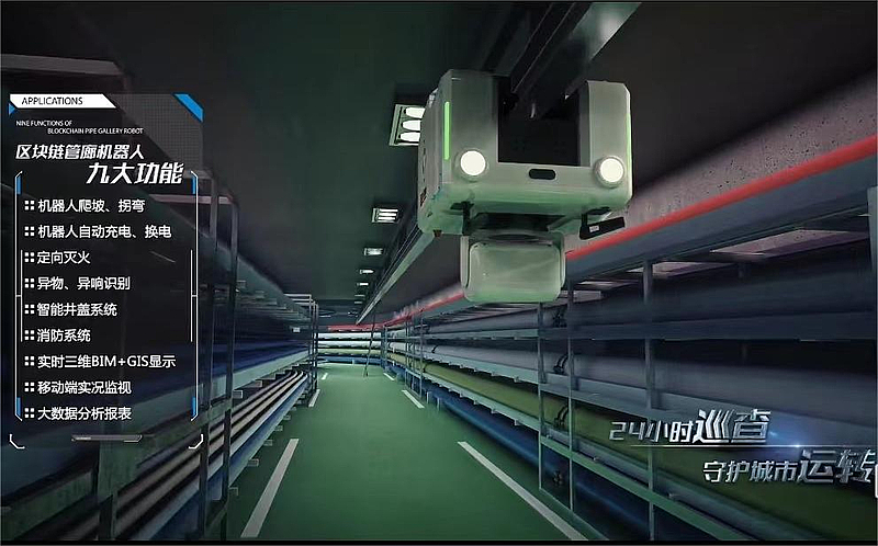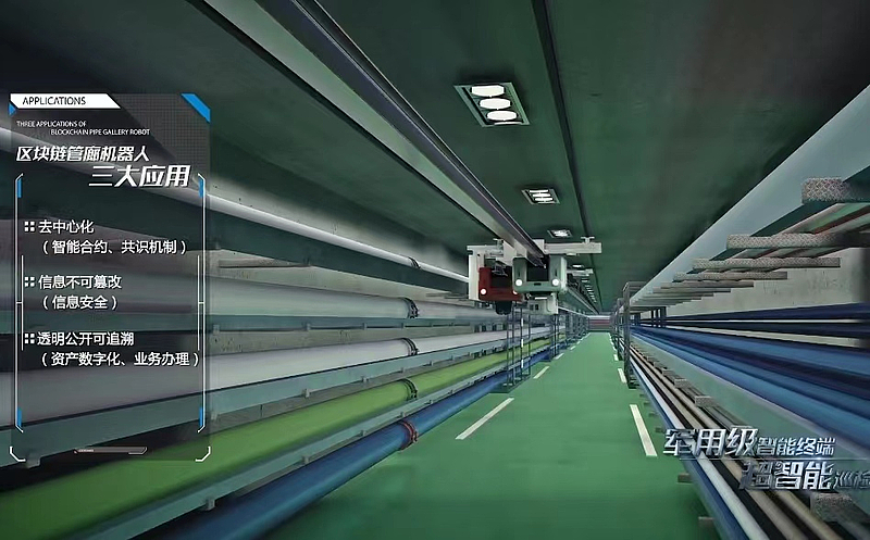 2017年,綜合管廊實施“機器人巡檢+定點基站+控制平臺”方案,通過加裝管廊機器人巡查系統(tǒng),實現(xiàn)了管廊內部溫度、濕度、水位、氣體、紅外熱成像、地基沉降等監(jiān)測功能,標志著新城綜合管廊步入“人工智能1.0時代”。2020年8月底,全球首個“區(qū)塊鏈+管廊機器人”智能巡檢監(jiān)測系統(tǒng)上線運行,標志著灃西新城綜合管廊開啟人工智能2.0時代。該系統(tǒng)利用區(qū)塊鏈技術去中心化、信息不可篡改、數(shù)據(jù)公開透明可追溯等天然優(yōu)勢,展現(xiàn)運維過程的三大應用場景。一是在中心服務器癱瘓情況下,巡檢機器人和滅火機器人觸發(fā)智能合約,在最短時間內發(fā)現(xiàn)并有效消除火災;二是鏈上數(shù)據(jù)一旦生成,節(jié)點數(shù)據(jù)無法篡改,確保數(shù)據(jù)安全可靠;三是基于區(qū)塊鏈架構的“GIS+BIM”數(shù)據(jù)共享至相關單位組成的聯(lián)盟鏈上,管線入廊手續(xù)辦理時間從1個月縮短至5個工作日,大大節(jié)省各項成本。升級的管廊機器人還具備自動充電、自動換電、智能變軌、拐彎爬坡、移動端管理、大數(shù)據(jù)分析等九大人工智能功能。