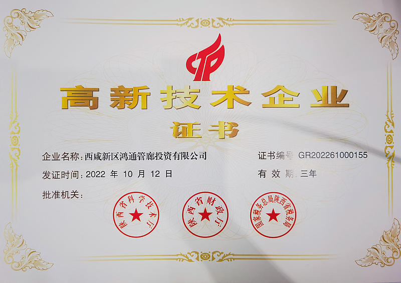 截至目前,獲得3項實用新型專利、3項發(fā)明專利、5項軟件著作權。2020年,榮獲西安市技術創(chuàng)新項目。2022年管廊公司先后完成2022年規(guī)模以上服務業(yè)企業(yè)入庫工作,并獲批2022年第一批高新技術企業(yè)。