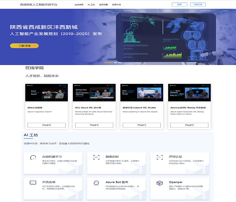 西咸新區人工智能開放平臺項目由集團公司二級子公司陜西微軟創新中心有限公司于2019年1月開始進行建設,2020年9月完成上線。平臺服務于我省高校、科研機構、開發型初創企業、政府、垂直領域各行業,提供人工智能方向教學及認證考試、技術資源、訓練平臺和數字化轉型解決方案的綜合性平臺。項目主要包含人工智能開放平臺、人工智能學院、人工智能加速器3大版塊,涵蓋線上與線下建設內容。